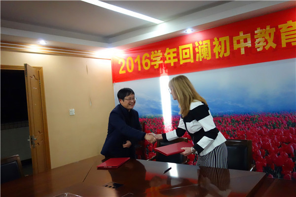 参观完瓜沥镇一中后,访问团一行来到萧山区回澜初级中学,双方进行了友好的交流和讨论,并且现场和蔡斯预备中学签约成为姊妹学校。随后周建定校长带领校长们参观校史馆和校园。