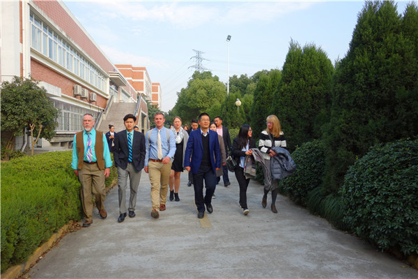 上图为萧山二中周斌校长带领美高校长访问团参观校园