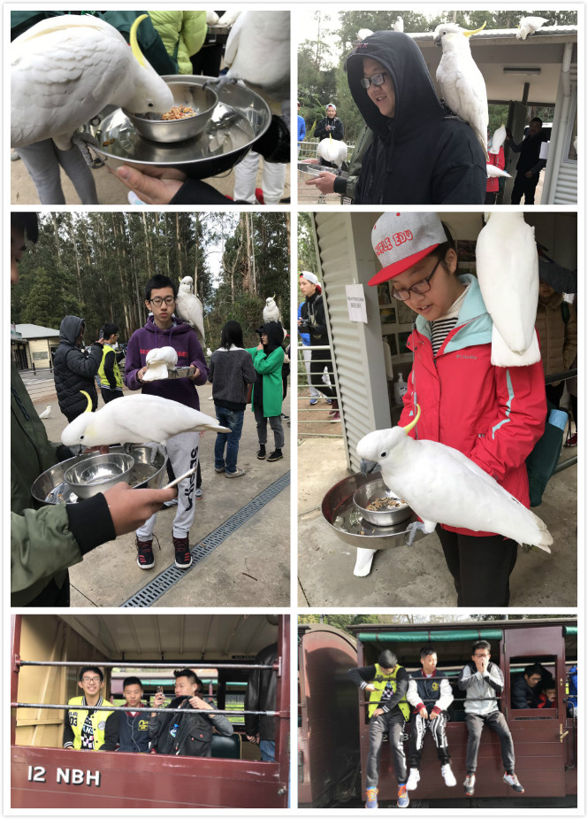 乘坐蒸汽小火车穿越丹迪农山:丹迪农山脉不止有瀑布、连绵起伏的丘陵和陡峭绝壁的峡谷,而且还是喷气比利号蒸汽机车的发源地;在这里,同学们看到了可爱的鹦鹉,纷纷喂食鹦鹉,享受和鹦鹉在一起的时光。